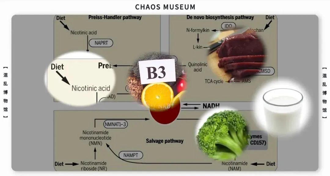 其中色氨酸可以從各種日常的高蛋白食物中攝入;煙酸和煙酰胺其實就是維生素B3,可以在各種動物內臟,紅肉,牛奶和蔬菜中攝取。