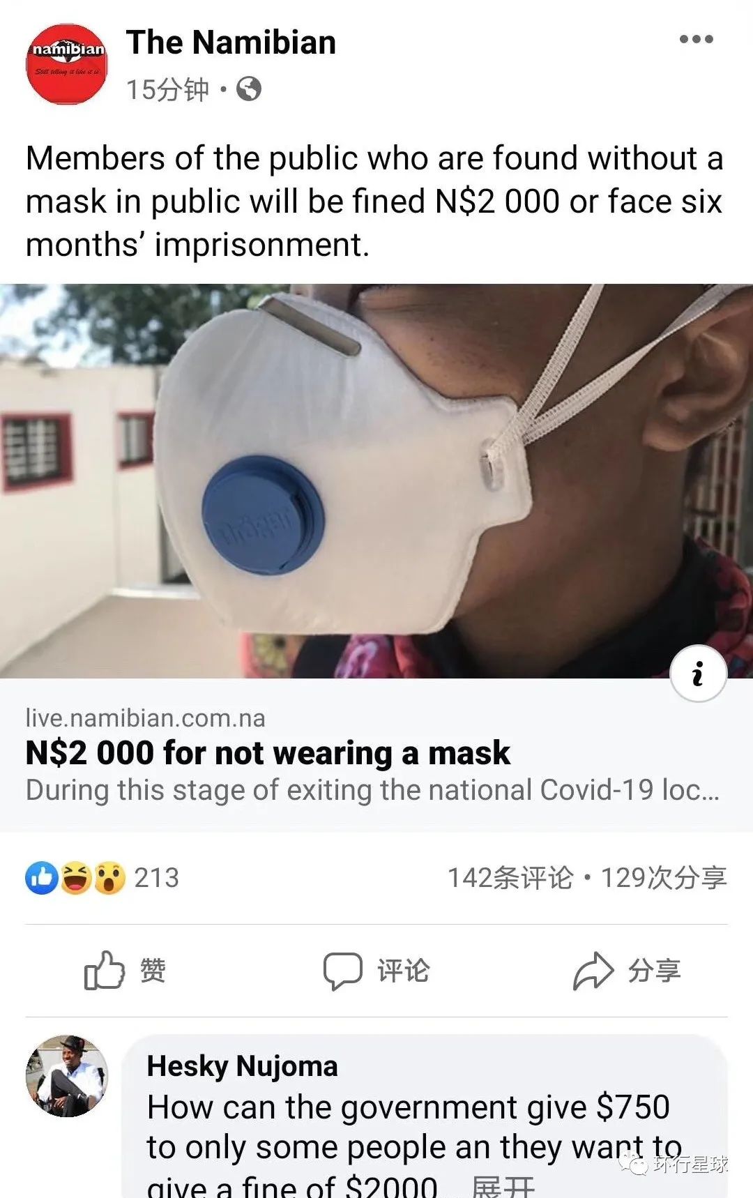政府規定公共場所不佩戴口罩的將罰款2000納元(約人民幣1000元)或拘留6個月,下面一片罵聲。