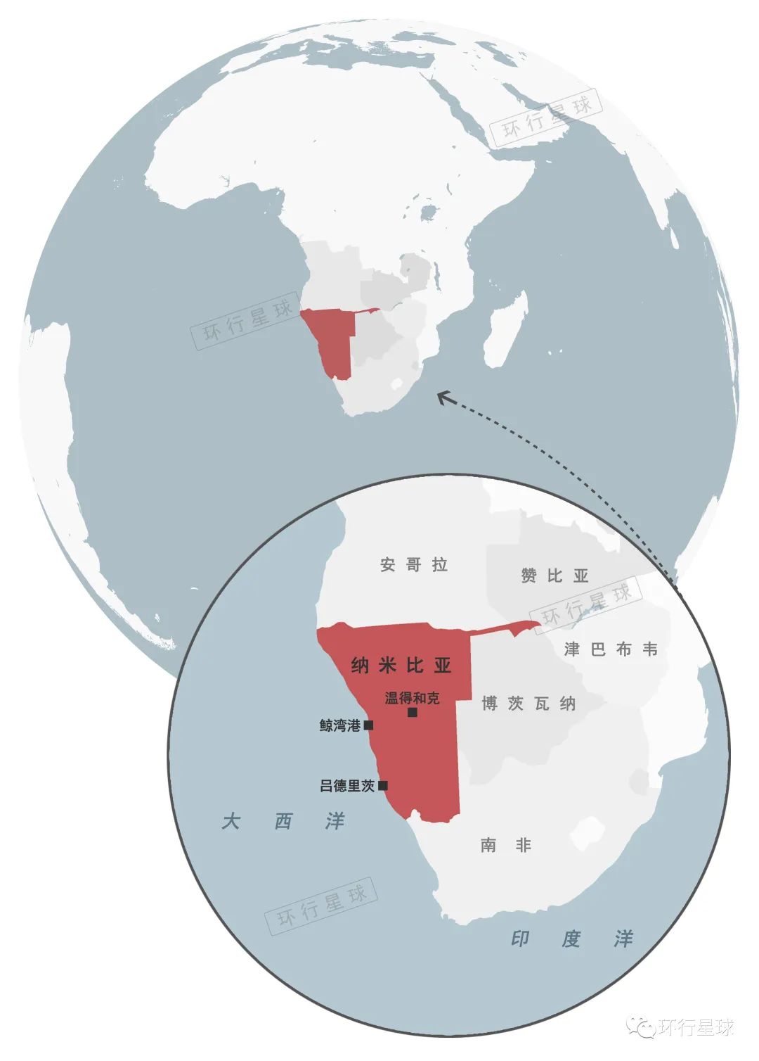納米比亞位於非洲西南部,毗鄰南非,東接博茨瓦納,北靠安哥拉,西面大西洋。