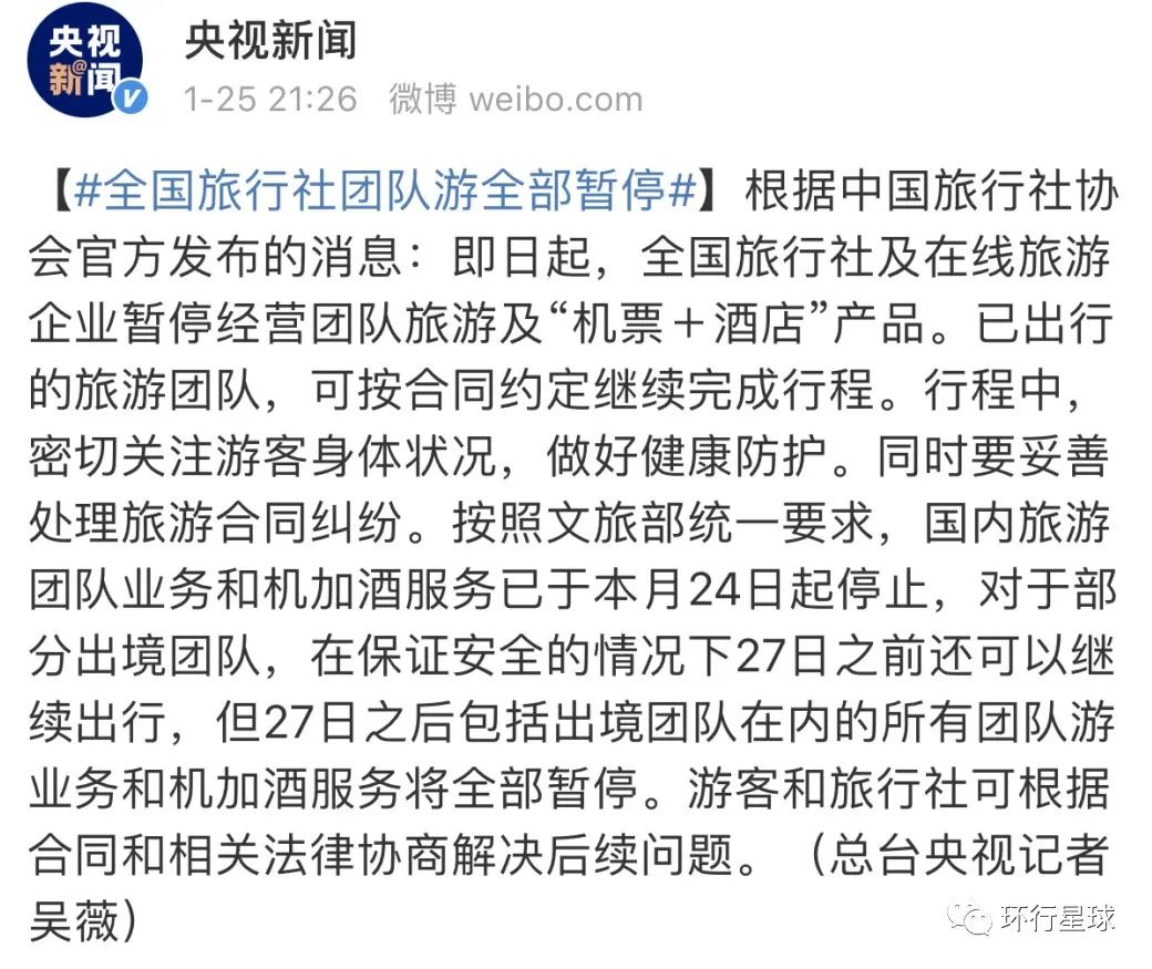 2020年1月23日,武漢宣佈“封城”。25日,國家宣佈暫停經營“機票+酒店”的旅遊產品,27號以後包括出境遊在內的旅行團組全部取消,旅遊行業基本停擺。