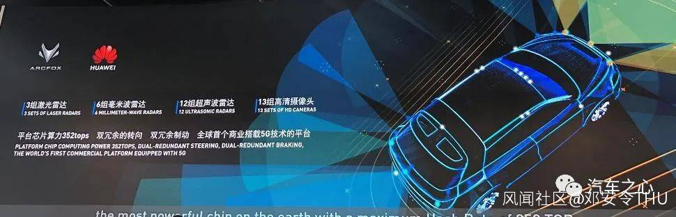 北汽 ARCFOX 的下一款代號為 HBT的車型,也將搭載激光雷達,包括 3 顆 96 線激光雷達、6 顆毫米波雷達,車載計算平台的算力會達到 352 Tops。