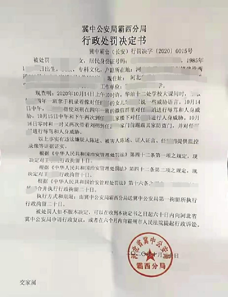 12月1日,河北省冀中公安局霸西分局發佈通報稱,舉報者王女士系因侮辱、威脅人身安全和擾亂單位秩序,被合併執行行政拘留20日。