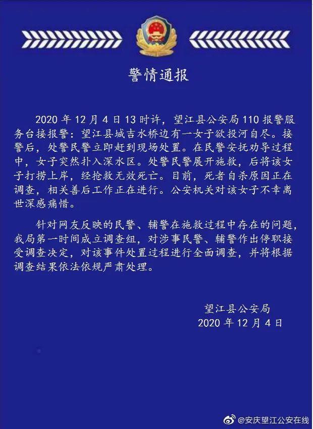 當晚,望江縣公安局通報稱,針對網友反映的警方在施救過程中存在的問題,將進行全面調查,兩位涉事的民輔警已被停職。