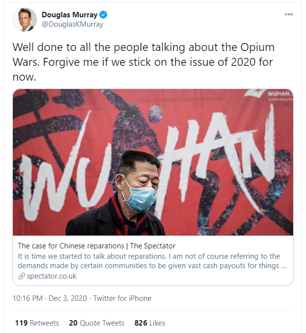 更惡劣的是,當有人質問這個英國右翼公知當年英國在鴉片戰爭中欺辱中國的行為時,這個公知居然宣稱,今天的英國人不該再為100多年前的事情負責,但新冠疫情發生在2020年,所以中國應該賠償。