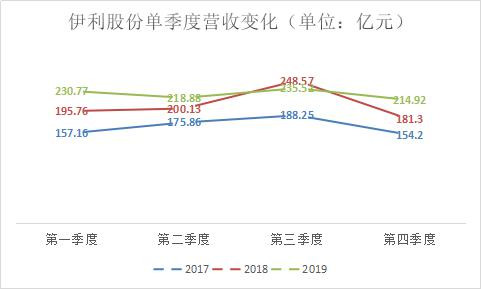 若2020年伊利股份如約完成千億元營收,就意味着第四季度要完成264.94億元的營收目標,這一數值要高出2020年第三季度營收。但觀察近3年數據可以看出,第三季度是伊利股份單季度營收的高峯。因此,伊利股份實現千億元目標的難度較大。