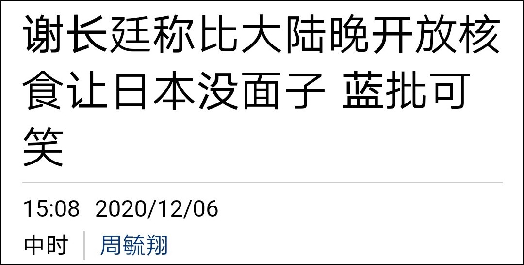 12月5日,台“駐日代表”謝長廷還為此造謠稱,大陸已經同日本就同一議題進行協商,如果大陸更早開放進口,“日本支持我們的政治家會很尷尬,很沒面子”。