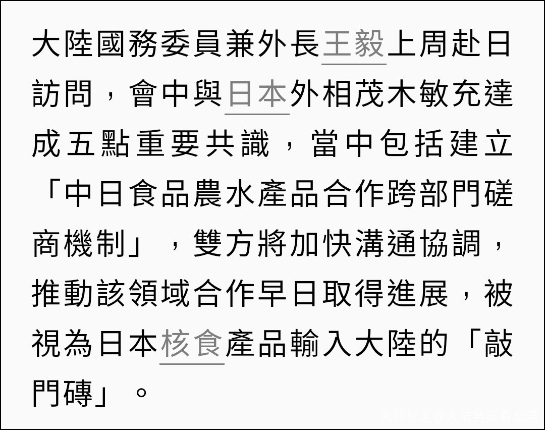 其中,六項具體成果的第二條提到,建立中日食品農水產品合作跨部門磋商機制,加快溝通協調,推動該領域合作早日取得進展。