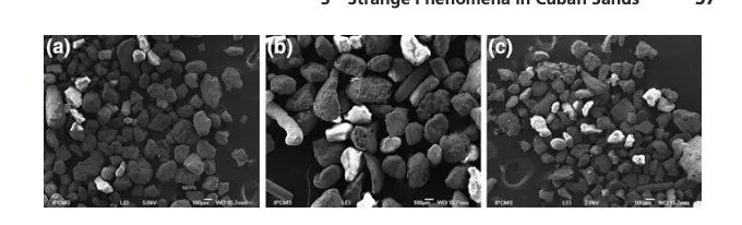 電子顯微鏡下,Santa Teresa的沙子(a)看起來和富含碳酸鈣的沙子(b)以及普通沙子(c)沒有什麼不同,但是其他兩種沙子並不會產生沙蛇。圖片來源:(DOI)10.1007/978-3-319-51624-0_3