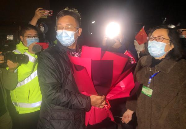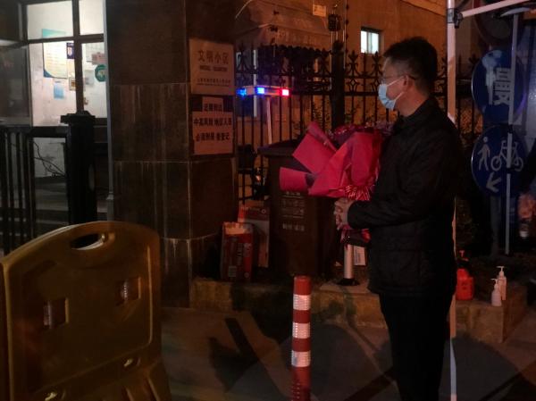 航城七路450弄小區一開,馬傑抱着手中火紅的玫瑰,在眾人見證下送給來接他回家的妻子。