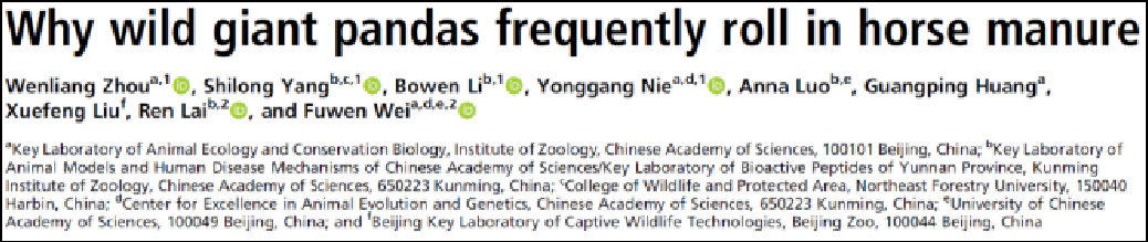 12月7日,中國科學院動物研究所魏輔文院士研究組與中國科學院昆明動物研究所賴仞研究組合作,在《美國國家科學院院刊》(PNAS)發表了題為:Why Wild Giant Pandas Frequently Roll in Horse Manure (為何野生大熊貓喜歡“滾馬糞”)的研究論文。
