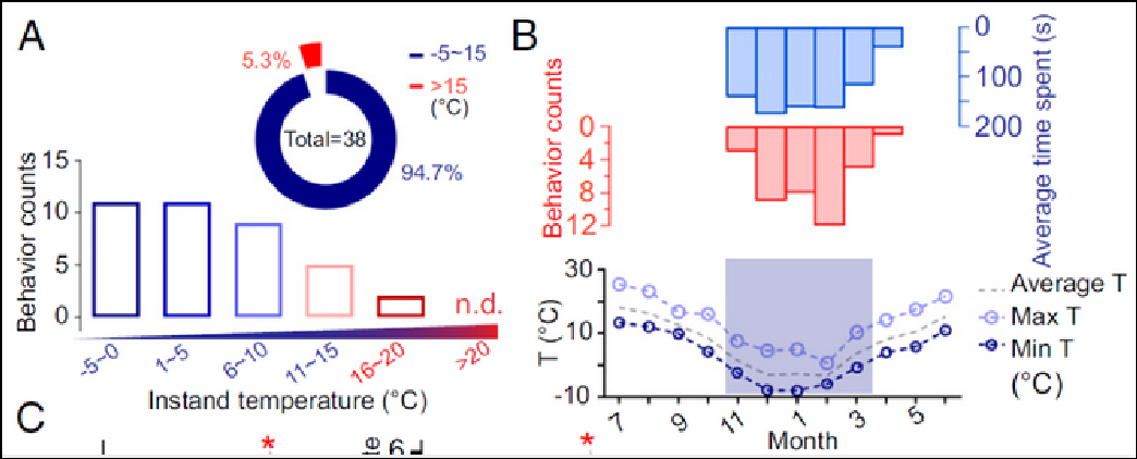 結合當地氣象數據研究,發現這一行為的發生概率與冬季環境温度降低呈正相關。
