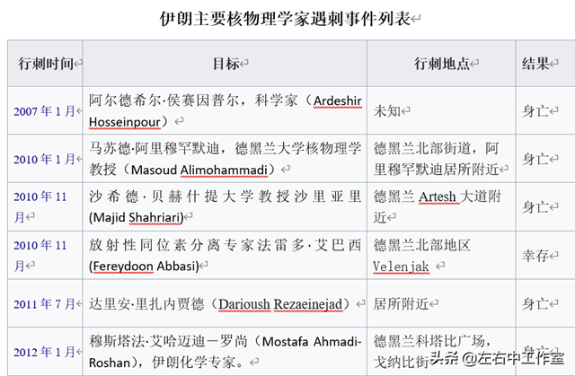 而且,這已經不是第一起伊朗核科學家遇刺的案例了。從2007年到現在,已經陸續有5名伊朗核物理學家遭到刺殺,背後的兇手都是以色列情報機構摩薩德。