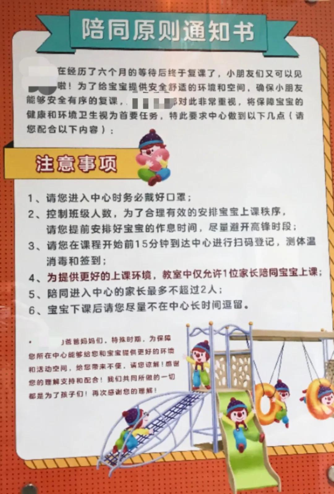 “他們會對孩子測温,要求洗手,生病了不能過來,對家長就不管了。”一位剛陪孩子上完課的家長抱怨道。