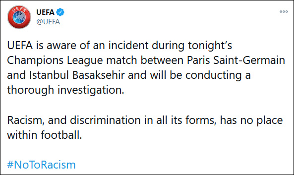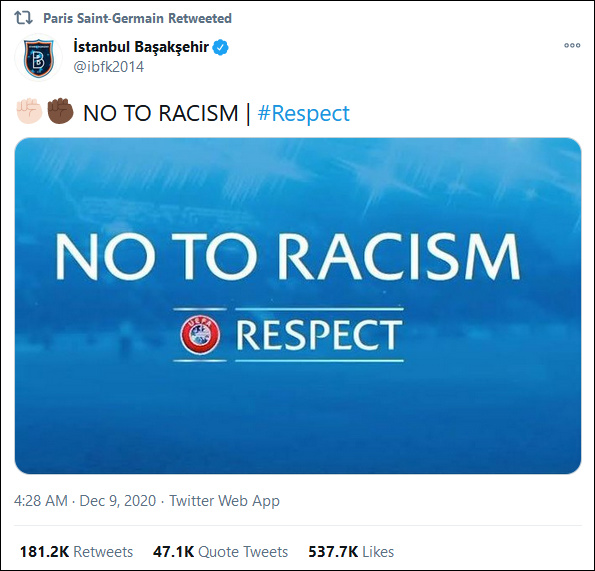賽後,伊斯坦布爾隊第一時間發佈了拒絕種族主義的推文,巴黎聖日耳曼轉發。