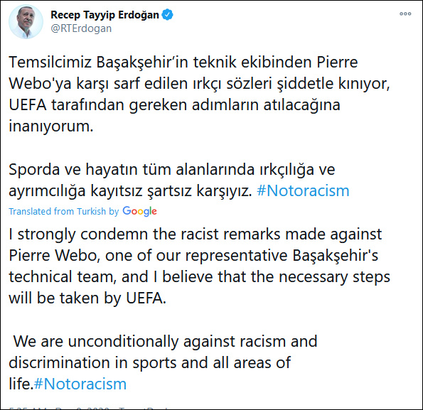 土耳其總統埃爾多安直接在推特上表態,“我強烈譴責對於韋伯的種族歧視,我相信歐足聯會採取必要的措施。我反對任何在體育和生活中的種族主義和歧視。”