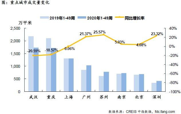2020年第1-49周重點城市:武漢、重慶和上海總成交面積居前三。從同比來看,監測的重點城市中,蘇州、深圳和廣州升幅較大,均超20%,上海升幅較小;僅武漢和重慶有所下滑,均在兩成左右。