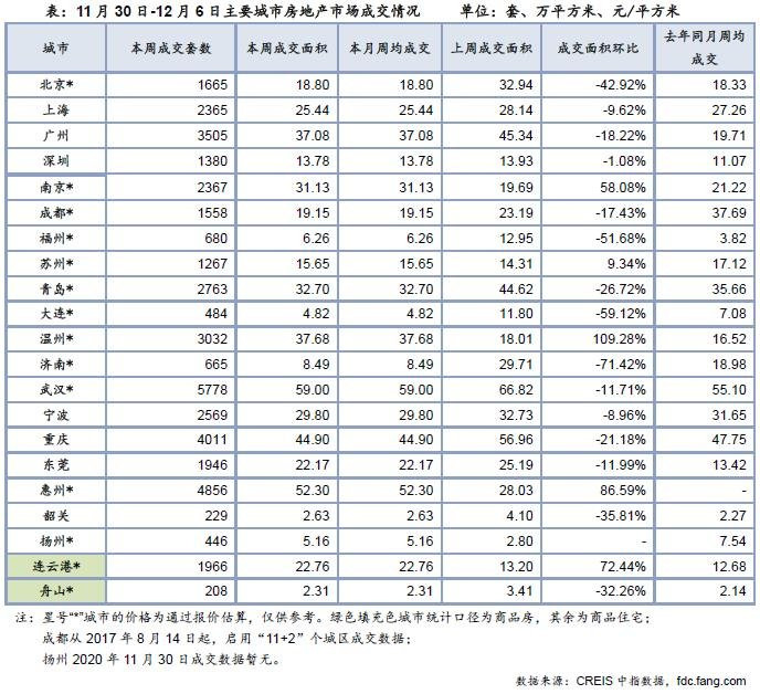 2020年12月7日,中指研究院發佈《第49期中國主要城市房地產市場交易情報(2020.11.30-2020.12.6)》。CREIS中指數據顯示,上週重點監測的20個城市成交環比下降7.3%。其中15個城市成交環比下降,佔監測城市的75%;與去年同期相比,20個代表城市成交量整體上升15.8%,其中13個城市成交同比均有所上升。