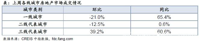 分城市來看,各線成交有所分化,僅三線代表城市同環比均升。環比來看,一線成交降幅大於二線,僅三線成交上升。同比來看,二線代表城市趨穩,一三線成交升幅相近。