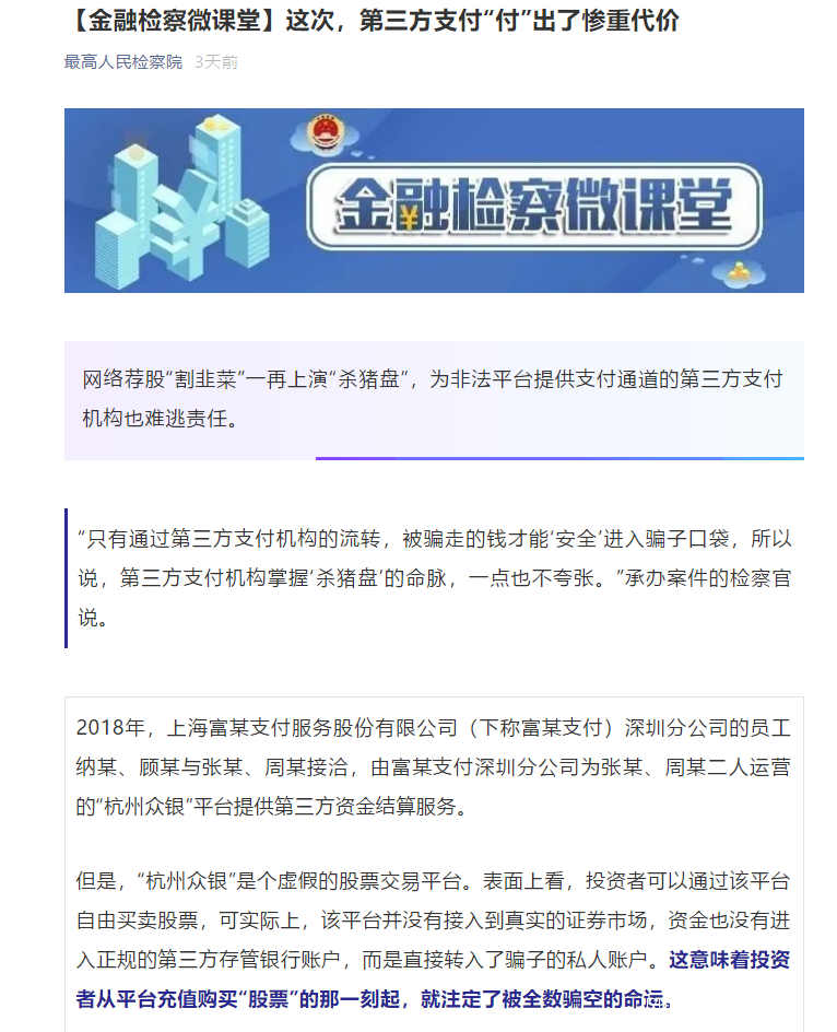 12月5日,最高人民檢察院官方微信公眾號發文點名第三方支付機構“富友支付”。