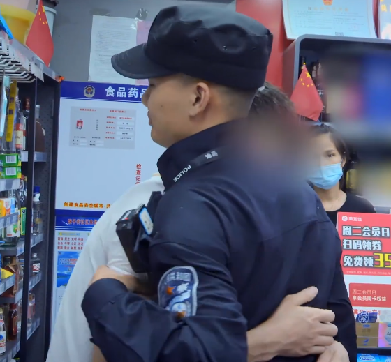 等警察蜀黍到達現場後,年輕男子在穿短袖的季節發冷顫抖,並向警察叔叔索要了一個温暖的抱抱,又搞了一出“抱警”的行為藝術。