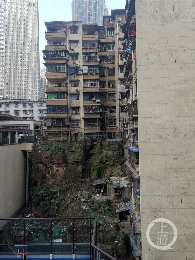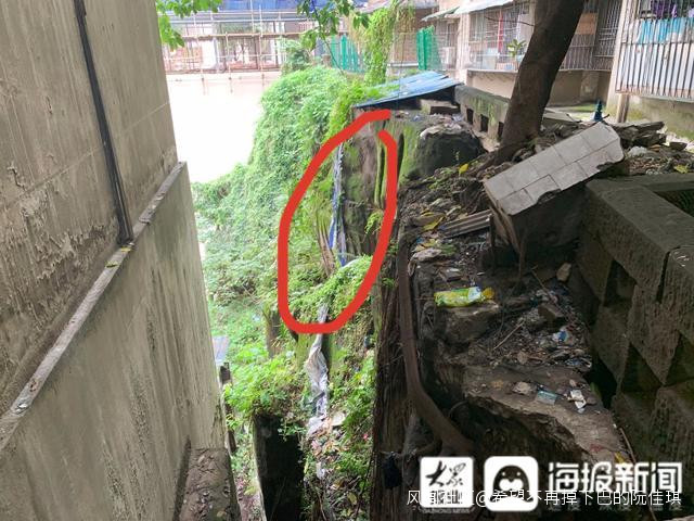 石像在小區旁的一處堡坎,上接小區人行過道,下則靠着樓底。