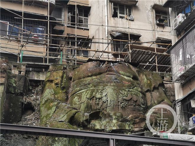 近日,重慶一老式小區在進行外牆改造時,竟意外發現其中暗藏了一座高約十米的巨大無頭石像,隱匿於市井之中。
