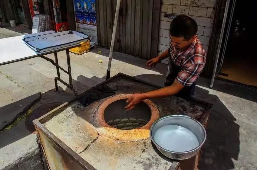 還不到下班的時間,很多人就已經聞香而來站在一旁等待,老闆不急不躁一個人看着兩口饢坑,時不時灑點鹽水進去,便進屋繼續包新的烤包子。