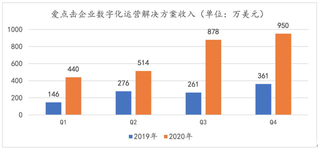2020年,愛點擊Q1的「企業數字化運營解決方案」收入440萬美元,到Q3已經實現878萬美元的收入,翻了一倍。