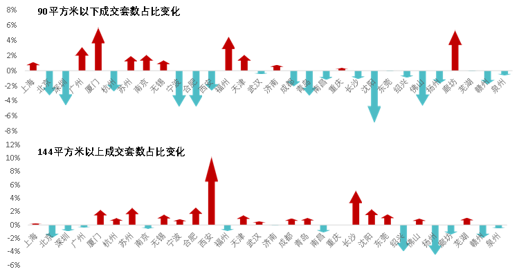 圖:2020年重點30城商品住宅90m2以下和144 m2以上成交套數佔比較2019年變化