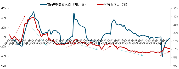 圖:2008年以來全國商品房銷售面積累計同比與M2同比走勢