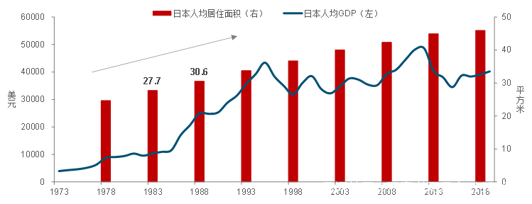 圖:城鎮居民人均住房建築面積和人均GDP擬合關係及變化趨勢
