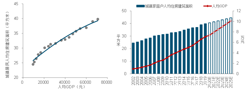 鑑於日本住房發展歷程對我國具備較強借鑑意義,通過對日本歷史數據的分析,我們發現,1983年日本人均GDP正式越過一萬美元門檻,其人均居住面積約27.7平方米,至1988年,人均GDP達到2.5萬美元,人均居住面積提升至30.6平方米,五年間人均居住面積提升3平方米左右;當下我國經濟及住房狀況與日本1980年代相似,預計未來五年我國人均住房建築面積存在4平方米左右(按照75%的平均得房率將人均居住面積轉化為人均住房建築面積)的改善空間,年均提升幅度在0.8平方米左右,在此基礎上,預計2025年城鎮人均住房建築面積將提升至44.5平方米。