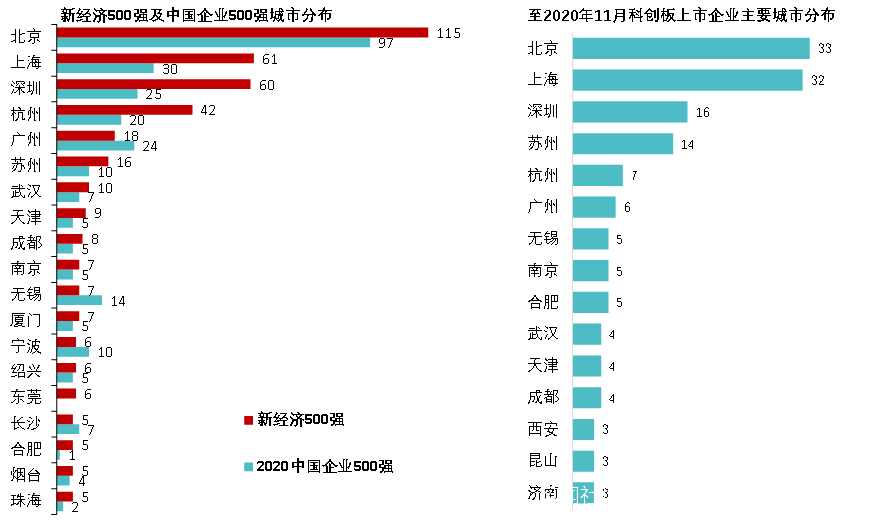 圖:新經濟500強和中國企業500強分佈、至2020年11月科創板上市企業城市分佈