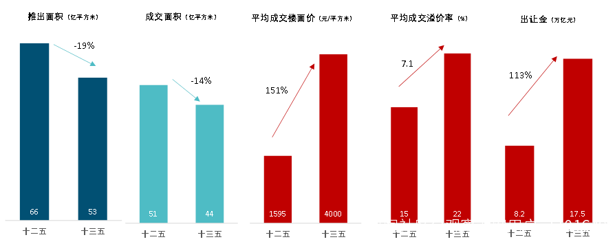 圖:“十二五”、“十三五”時期全國300城住宅用地推出、成交各指標對比