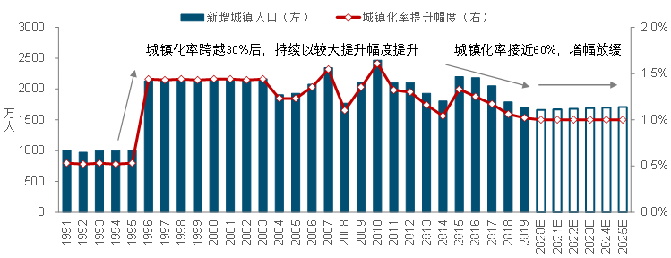 圖:1991-2025年全國新增城鎮人口及年增城鎮化率變化趨勢