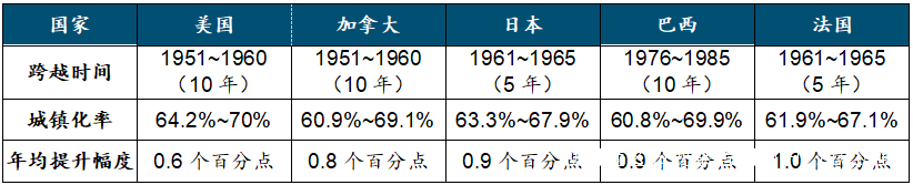 表:部分國家城鎮化率跨越60%時年均提升幅度