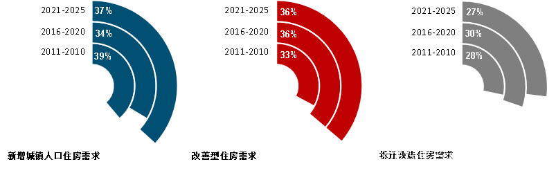 (2) 需求結構分析:新型城鎮化背景下新增城鎮人口帶來的住房需求將繼續發力,改善型住房需求佔比高位穩定,拆遷改造住房需求將有明顯回落