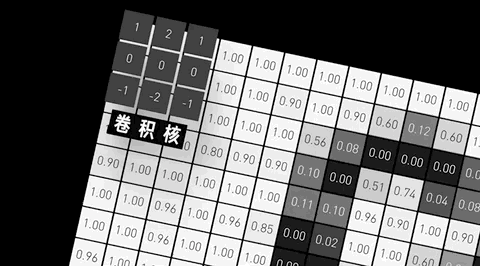 所以為了提取特徵也減少運算,我們用這樣叫「卷積核」的東西,一個區域一個區域地掃,將每個對應的數字相乘,再求和,就提取了區域數值特徵。