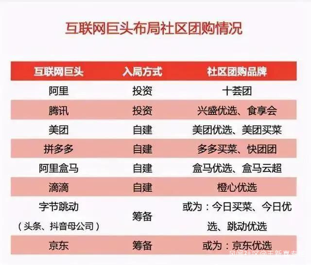 另一方面,也與巨頭們面臨增長瓶頸相關。在今天,新增用户已經見頂,巨頭在流量增長遇到瓶頸的時候,這個高頻且充滿巨大流量的行業就被盯上了。巨頭們需要給資本市場講新的故事。其三,從巨頭們的佈局來看,或許它們也並沒有想好要怎麼做,也並不確定社區團購是否有前途,只不過,當看到對手在佈局,自己恐落於人後,是一種被動的跟進策略。