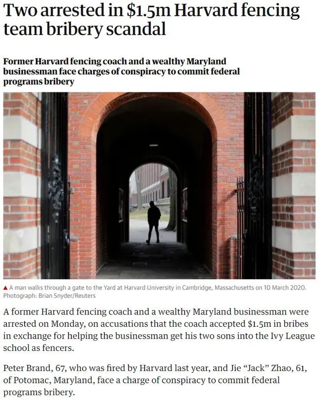 去年,哈佛大學前擊劍隊教練布蘭德(Peter Brand)被曝光受賄,他幫助一位美籍華裔富商趙捷的兩個兒子以擊劍特招長的方式進入哈佛。