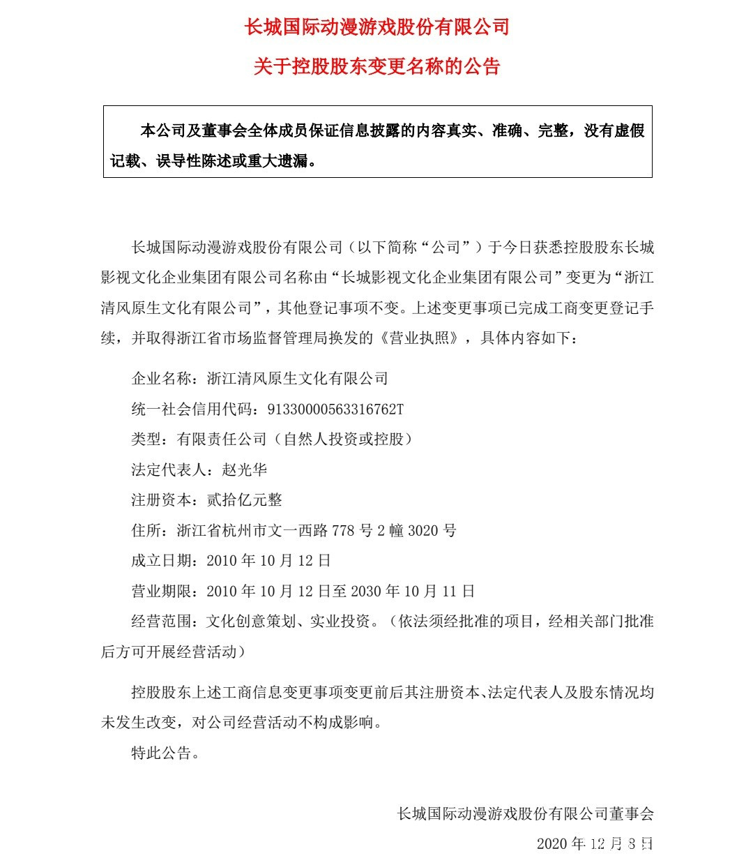 12月8日,*ST長動發佈公告稱,長城國際動漫遊戲股份有限公司於今日獲悉控股股東長城 影視文化企業集團有限公司名稱由“長城影視文化企業集團有限公司”變更為“浙江清風原生文化有限公司”,其他登記事項不變。12月7日,*ST長城發佈公告稱,公司控股股東公司名稱發生變更。