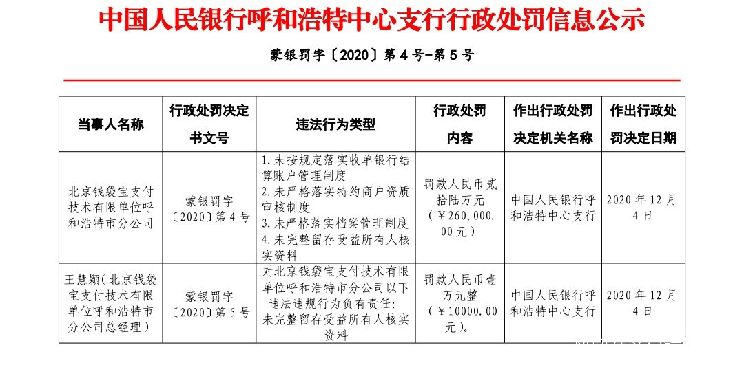 12月8日,中國人民銀行呼和浩特中心支行發佈公告,北京錢袋寶支付技術有限單位呼和浩特市分公司因未按規定落實收單銀行結算賬户管理制度;未嚴格落實特約商户資質審核制度;未嚴格落實檔案管理制度;未完整留存受益所有人核實資料,被處罰款26萬元人民幣。北京錢袋寶支付技術有限單位呼和浩特市分公司總經理王慧穎對上述行為負責,被處罰款1萬元。