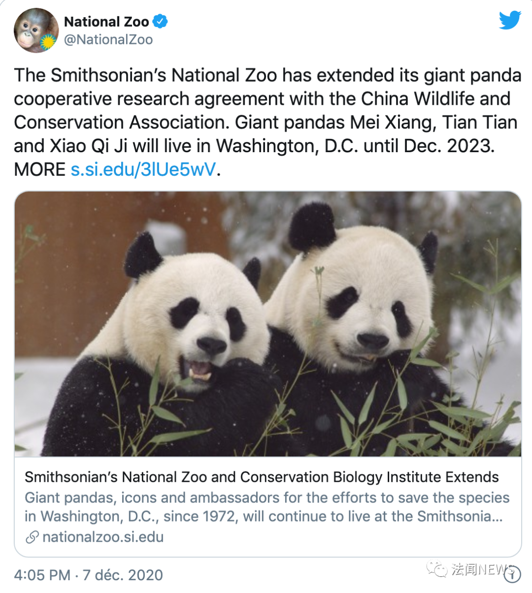 12月7日,華盛頓動物園與中國野生動物保護協會的合同到期,而同日,動物園方宣佈,園方與中方同意延長合作合同,三隻大熊貓將可以在美國首都再呆三年,到2023年12月7日。