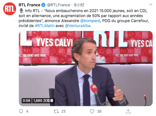 家樂福的首席執行官Alexandre Bompard在做客RTL時宣佈,該大型分銷集團將在2021年“以CDI合同或alternance合同招聘15000名年輕人”,並補充道,“這比平時要多了50%”。