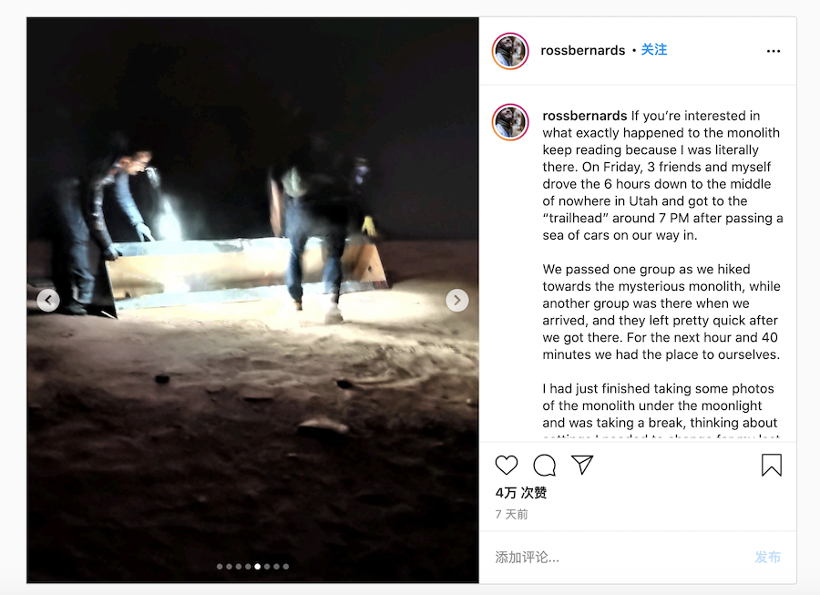 不過還沒等政府部門出手,上週六,猶他州土地管理局在Facebook上發佈消息稱,11月27日晚,一夥“不明身份”的人已經搬走了這塊“巨石”。