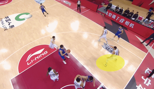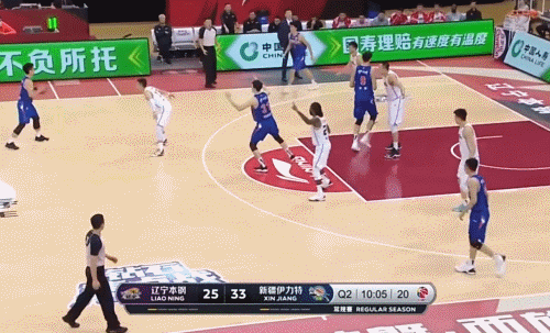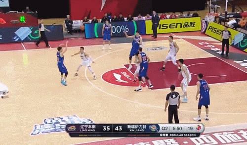 所以,遼寧用了相當長時間的聯防,尤其在第一、三、四節。**聯防身高不夠,遼寧就收縮,經常在低位二防一,給弱側非常大的空間,這就是齊麟三分神準的秘密。**在全部10個三分中,有一半來自新疆隊破聯防的效果。