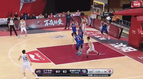 齊麟進的前三個三分,均來自4號位落高位以後,受了包夾進行轉移,助攻者分別來自於德豪、唐才育和周琦。遼寧對年輕的艾孜麥提都進行收縮夾擊,説明執行防守策略有點機械。下面兩個動圖,分別是齊麟第一和第三個三分。