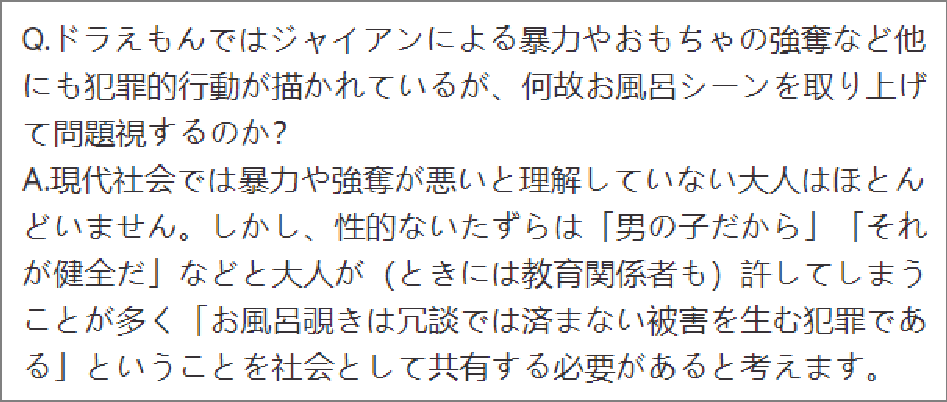 “我贊同。在劇情中,從來沒有描寫過偷窺靜香入浴行為被社會制裁的情況,所以偷窺很難被認為是犯罪。很多長年居住在日本的人從小就習慣了偷窺、掀裙子等性犯罪。”