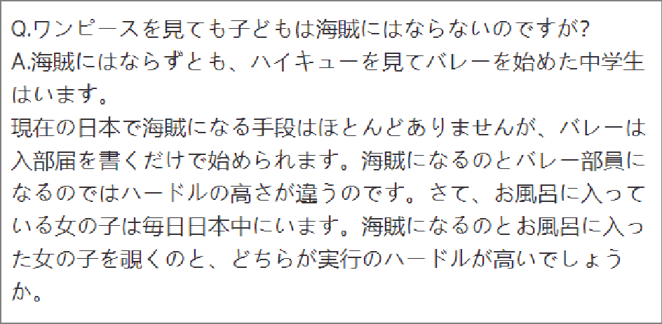 對此,提議者表示,雖然沒有人去當海賊,但也有看了排球類動漫後選擇練排球的中學生。