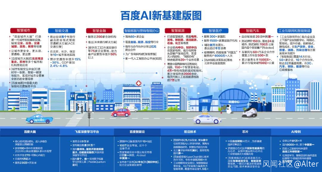 6月份百度 AI 新基建版圖正式亮相,在百度大腦、飛槳、百度智能雲、芯片、數據中心等在內的新型 AI 技術基礎設施的支撐下,百度將推動智能交通、智慧城市、智慧金融、智慧能源、智慧醫療、工業互聯網和智能製造等領域實現產業智能化升級,目標是成為中國新基建 AI 服務最大提供商;